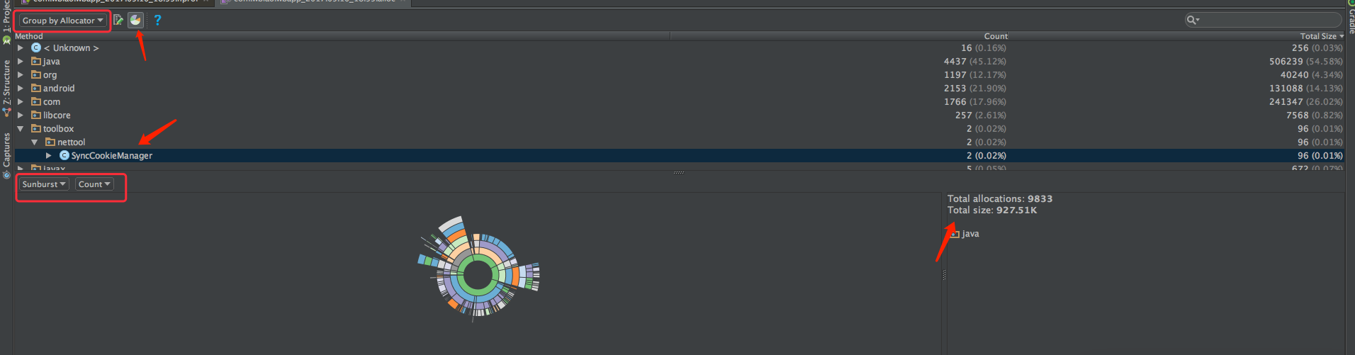 - start Allocation Tracking 开始分配追踪,第一次点击可以指定追踪内存的开始位置,第二次点击可以结束追踪的位置。这样我们截取了一段要分析的内存,等待几秒钟Android Studio会给我们打开一个Allocation视图