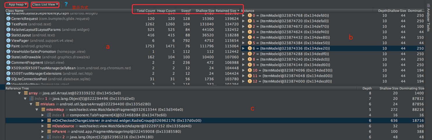 我们看着上图来分析,显示左上角的显示方式,有两个选项分别是Heap区域和Class List View的展示方式.