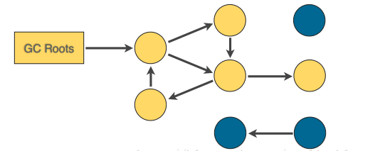 上图蓝色圈圈表示是内存中的对象,圈圈之间的箭头是对象的引用,上面的对象有的在使用,有的已经不再使用,那GC操作会从一个叫作Roots的对象开始检查。
