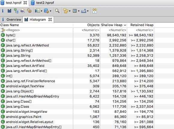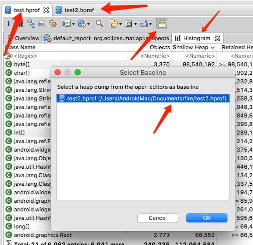 打开两个时间点的.hprof文件,都打开了Histogram标签,然后按右上角Compare to anther Heap Dump按钮,进行对比.