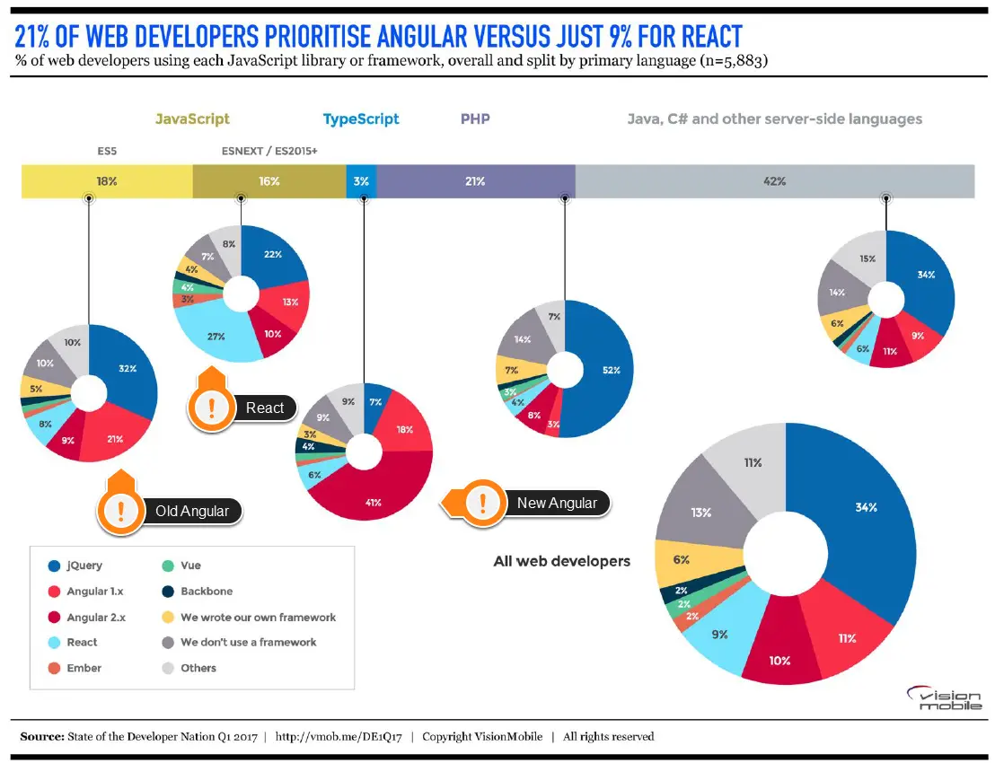 React 是由 Facebook 发起的库。Angular 是从 Google 衍生出来的框架。有很多分析把它们做了比较。总的来说,Angular 处于领跑地位,与此同时 Vue.js 正在受到大量关注。Angular 在 TypeScript 的用户圈中受到追捧,41% 的人倾向于 2.x 版本,另外 18% 的人则更喜欢老版本。随着近期 Angular 4 的发布以及 TypeScript 的日益流行,我们预计 JavaScript 的战争还将持续下去(Lawrence Hecht)。