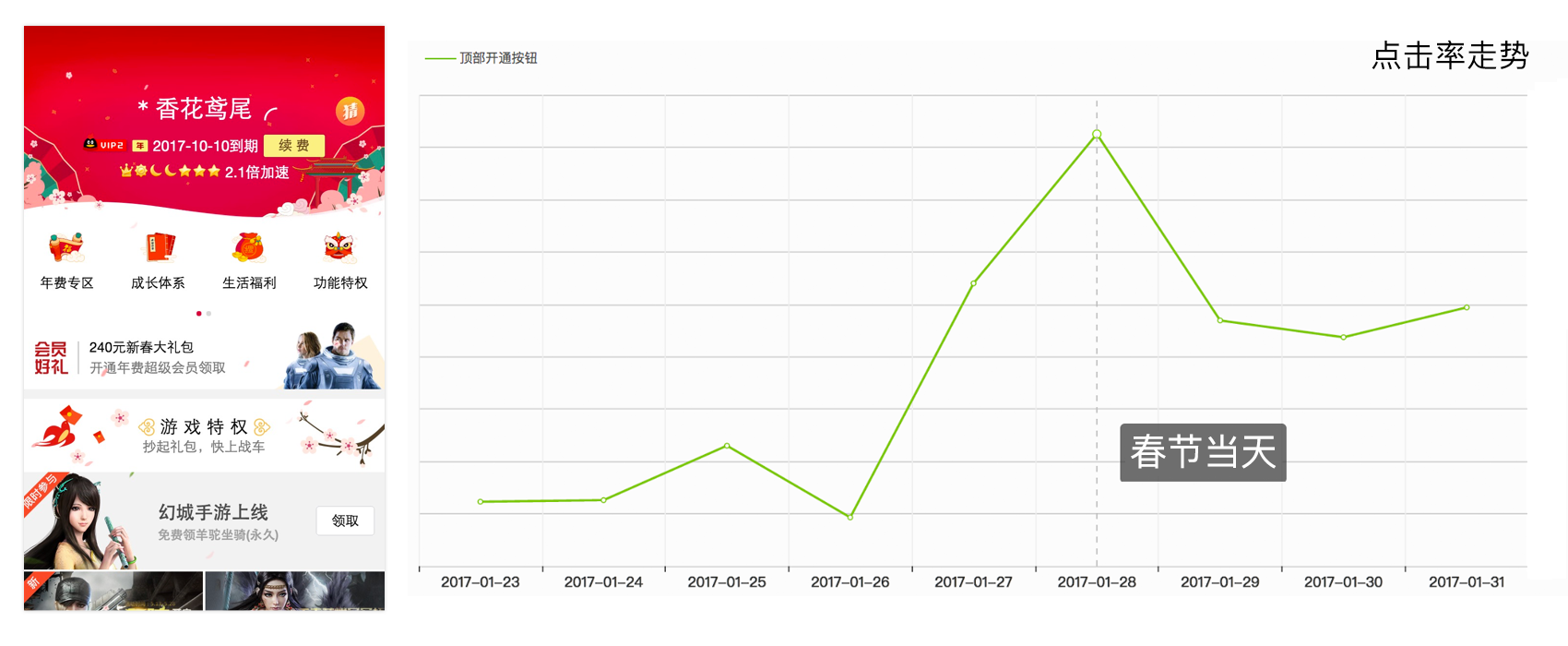 临近农历春节,设计师为所在业务设计了一套春节氛围,并在除夕前几天发布上线。节后观察数据,发现春节期间页面顶部续费按钮点击率波动上升,相较春节前提升幅度很大: