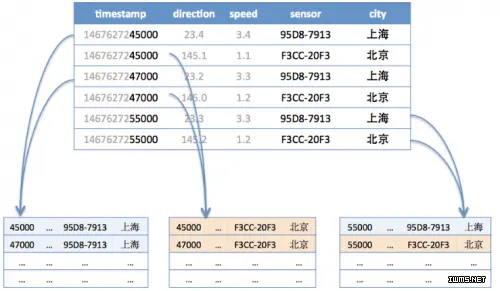 如下图,第一行和第三行都是同样的tag(sensor=95D8-7913;city=上海),所以分配到同样的分片,而第五行虽然也是同样的tag,但是根据时间范围再分段,被分到了不同的分片。第二、四、六行属于同样的tag(sensor=F3CC-20F3;city=北京)也是一样的道理。