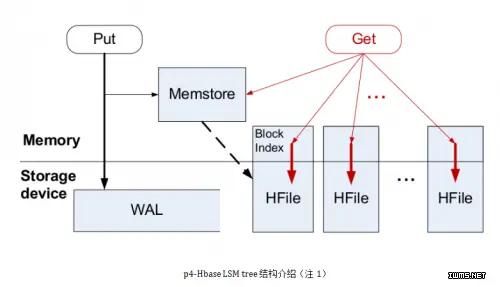可以看到LSM tree核心思想就是通过内存写和后续磁盘的顺序写入获得更高的写入性能,避免了随机写入。但同时也牺牲了读取性能,因为同一个key的值可能存在于多个HFile中。为了获取更好的读取性能,可以通过bloom filter和compaction得到,这里限于篇幅就不详细展开。