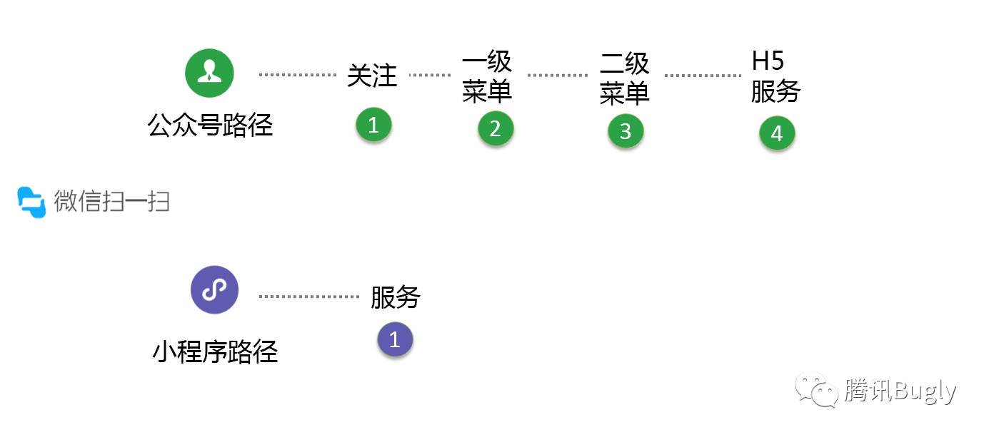 我们来看一下经典的公众号+H5的方式,用户需要关注,然后到一级菜单,二级菜单,再到服务。