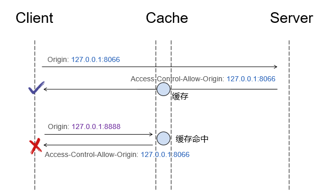 上图中,第一个请求(Origin: 127.0.0.1:8066)响应被浏览器缓存了,当第二个请求(Origin: 127.0.0.1:8888)发起,被错误命中了前一个请求的缓存,收到了 Access-Control-Allow-Origin:http://127.0.0.1:8066 的响应时,将导致资源加载失败。