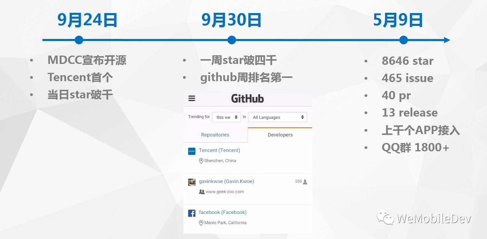 Tinker的开源地址为:github.com/Tencent/tin…。它作为Github/Tencent的第一个开源项目,也让Tencent第一次在Github周排名第一。微信也在持续使用Tinker,并且我们承诺与外部开发者使用同样的开源版本。
