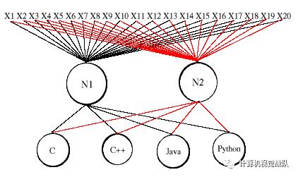 我们的方法是将字符统计限制到C、C++、Java 和Python 代码字符库中最常用的20 个非字母数字字符。由于关注浮点运算的执行,我们打算用一种规格化因素将这20 字符统计分开来,并以此培训我们的网络。显然,一个结构上的不同是我们的网络有20 个输入节点,但这是很正常的,因为我们的描述已经暗示了这种可能性。一个更有意思的区别是出现了一对中间节点,N1 和N2,以及输出节点数量从两个变成了四个(O1 到O4)。
