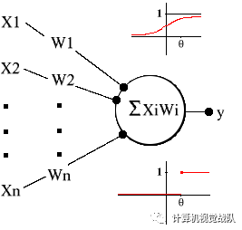 首先,有输入值以及它们的权系数:X1, X2, ..., Xn 和W1, W2, ..., Wn。接着是求和计算出的Xi*Wi ,产生了激发层a,换一种方法表示: