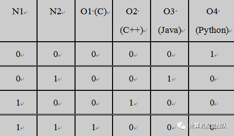 我们将训练 N1,当它一看到C 或C++,设置y1=1,看到Java或Python,它将设置y1=0。同理训练N2,当它看到C 或Java,设置y2=1,看到C++ 或Python,设置y2=0。此外,N1 和N2 将输出1 或0 给Oi。现在如果N1 看到C 或C++,而且N2 看到C 或者Java,那么难题中的代码是C。而如果N1 看到C 或C++,N2 看到C++ 或Python,那么代码就是C++。这个模式很显而易见。所以假设Oi 已被培训并根据下面表格的情况输出1 或0。