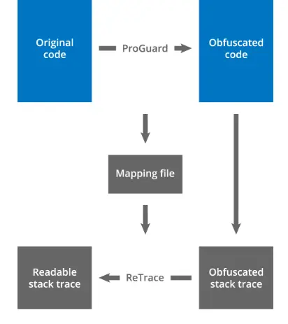 ReTrace是ProGuard的“去混淆”堆栈跟踪的配套工具,ReTrace可以读取一个混淆的堆栈信息,并将其恢复到没有混淆的情况。恢复基于ProGuard在混淆过程中可以写出的映射文件mapping.txt。映射文件将原始类名和类成员名称链接到其混淆名称,它被放在/tools/proguard/lib/目录下,大致工作流程如下图: