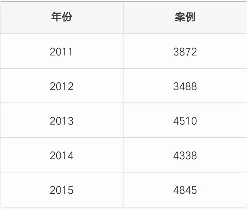 以下是美国公平就业与住房部公布的 2011年-2015年受理的年龄歧视案件数: