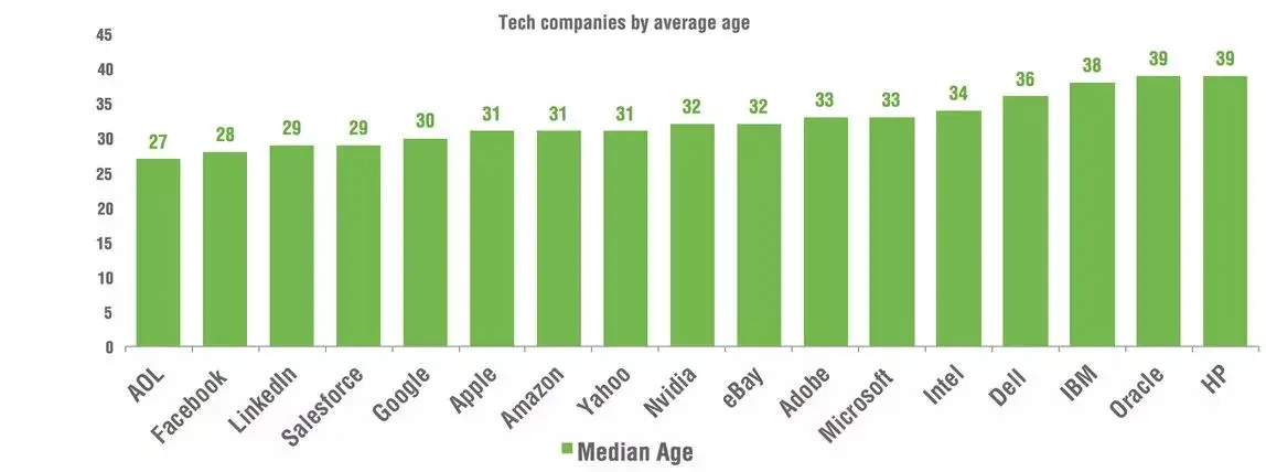 据统计,美国工人年龄的中位数是42岁。但是,Facebook,Google,LinkedIn,和Salesforce的员工年龄中位数是30岁或以下。其中,Facebook 员工年龄中位数为28岁。