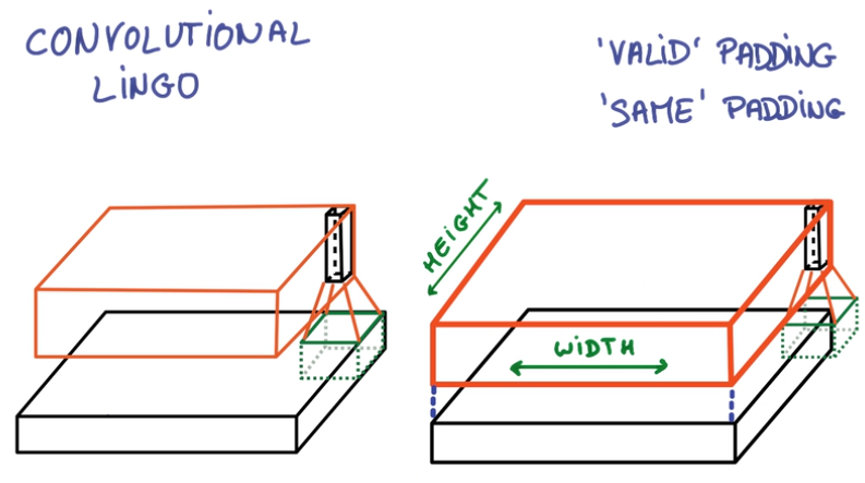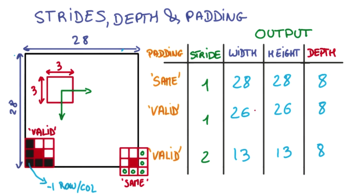 - 在边缘上的取样影响Conv层的面积,由于移动步长不一定能整除整张图的像素宽度,不越过边缘取样会得到Valid Padding, 越过边缘取样会得到Same Padding