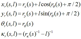 其中s代表道路的中心线切向方向的位移(也称为纵向位移s)。于此对应的是道路的中心线垂直方向位移l,也称之为横向位移。如果考虑一个车辆的姿态点p点在道路上(s,l)坐标,那么其实际的姿态和(s,l)的关系