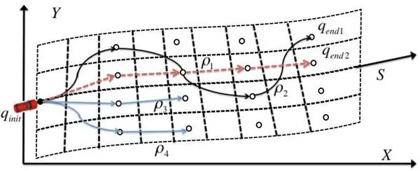 在上述的车辆模型和道路模型下,我们讨论轨迹规划所产生的轨迹曲线。首先我们定义车辆的轨迹(Trajectory)为一个从[0,1]区间到车辆姿态向量集合C={x? }的连续映射:ρ:[0,1]→C 。其中,车辆的初始姿态向量为x? =(x,y,θ,k)。每条轨迹终点处如图7所示,轨迹1的终点姿态为ρ1(1)=qend1轨迹2的终点姿态向量为ρ2(1)=qend2,初始姿态为ρ1(0)=ρ2(0)=qinit。轨迹优化的目标便是在所有可能的轨迹曲线中,筛选出满足边界条件的轨迹曲线,再寻找一条/若干条平滑且Cost函数最低的曲线。其中轨迹的候选曲线我们用类似在路由寻径(Routing)模块中介绍的“撒点”的采样方式来生成。参考图7,在某条Lane的SL坐标系下,我们按照均匀切分的S和L方向的方格内,在固定S和L间隔下,考虑每个(si,lj)区域的中心点(如图7所示,又称为轨迹点Trajectory Point)。一条候选的轨迹(Trajectory)便可以看做是沿着Lane的中心线纵向位移s方向连接不同Trajectory Point的平滑曲线。在图7所示的道路SL分割和采样下,可能的Trajectory Point有16个(4个s位置,4个l位置),从车辆的初始位置出发,我们只考虑在s方向单调增大的可能,不考虑城市综合道路行驶中的倒车情况,那么总的候选曲线的总条数为44=256条。轨迹优化便是要在这256条候选的曲线中找出Cost最优的轨迹。