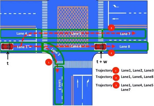 Trajectory 3:Lane 1、Lane 4、Lane 5、Lane7对应换道后直行通过路口。