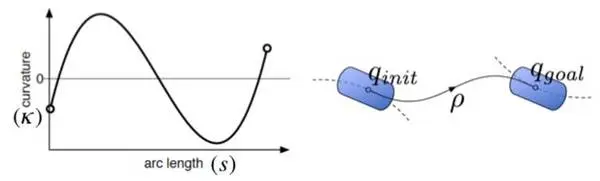 我们采用多项式螺旋线来连接轨迹点Trajectory Point,从而生成候选的曲线。多项式螺旋线,如图8所示,代表了一类曲率可以用弧长(对应我们轨迹中的s方向)的多项式函数来表示的曲线簇。我们使用三阶(Cubic)或者五阶(Quintic)的多项式螺旋线,其曲率K和轨迹弧长S的关系K(S)为: