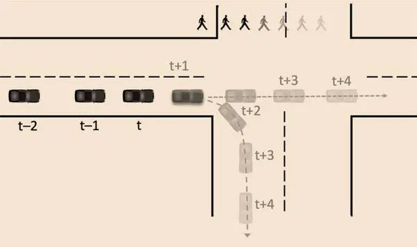 行为预测的轨迹,既包括了障碍物在将来一段时间内运动的方向,还体现了它们在运动中的速度变化。譬如行人过马路的时候会预测他们使用较为恒定的步行速度,车辆转弯的时候会先减速后加速,而加减速的快慢也取决于弯道的弧度和长短。实际的无人车系统中,往往将宏观层面的行为预测和轨迹生成抽象成两个问题来解决。
