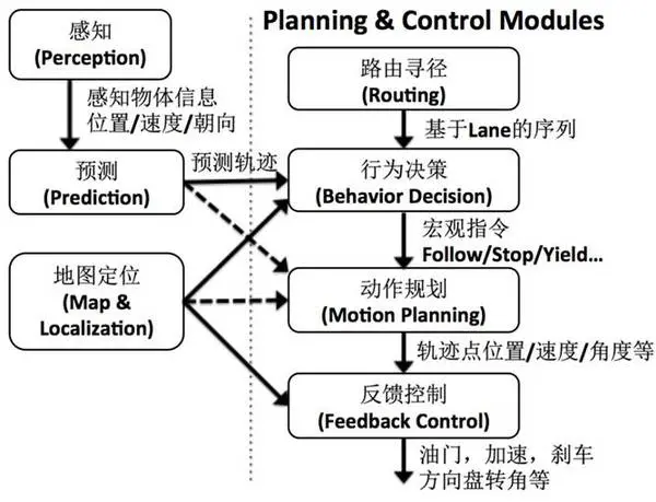 无人车作为一个复杂软硬件结合系统,其安全可靠运行需要车载硬件、传感器集成、感知预测,以及控制规划等多个模块的协同配合工作。作者认为最关键的部分是感知预测和决策控制规划的紧密配合。狭义上的决策规划控制部分,包含了无人车行为决策(Behavior Decision)、动作规划(Motion Planning), 以及反馈控制(Feedback Control)这三个模块。而从更宽泛的概念来说,无人车的决策规划控制模块,紧密依赖于上游的路由寻径(Routing)以及交通预测(Prediction)的计算结果,所以本文也对路由寻径和交通预测模块进行介绍。