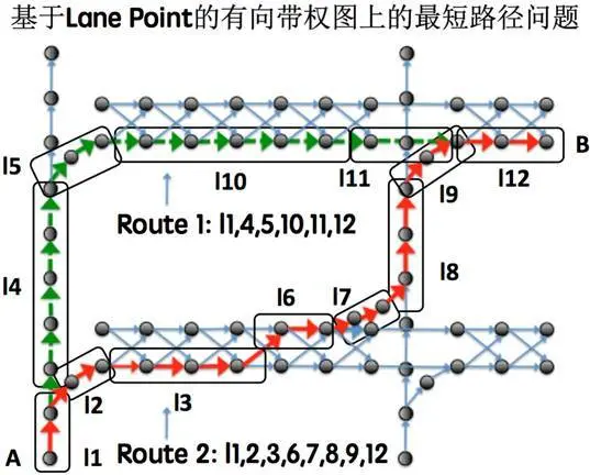 图4 无人车路由寻径模块(Routing)的高精地图道路(Lane)级别寻径路由