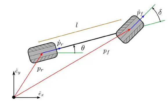 无人车反馈控制模块中常用的车辆控制模型为自行车模型。在该模型中,车辆姿态(Pose)是处于一个二维的平面坐标系内,并且可以由车辆所处的位置(position)以及车身和坐标平面的夹角(heading)来完全描述。同时我们假设车辆前后轮由一个刚性(rigid)不变的轴连接,其中车辆的前轮可以在一定的角度范围内自由转动,而车辆的后轮保持和车身的平行关系不能转动。前轮的转动对应实际车辆控制中方向盘的转动。
