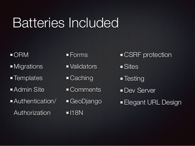 Django基于“自备军需”的理念,您不必使用单独的库来实现常见功能,例如身份验证,URL路由,模板系统, 对象关系映射器(ORM)和数据库模型迁移。 如果您正在使用或曾经用过Flask,您一定注意到了它需要调用其他库,如Flask-Login来执行用户身份验证。 Django不是这样。