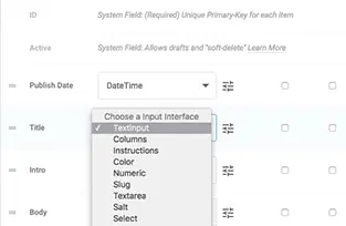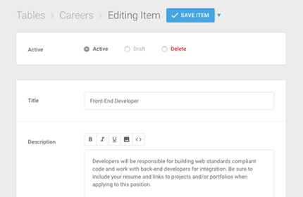 Viewing & Editing Items On the Edit/Create page you are presented with inputs and interfaces based on the schema (column datatype & length). Intelligent defaults will render
