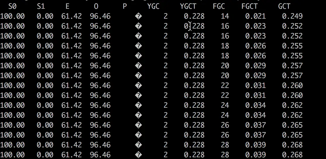 1、JVM参数中没有-XX:+CMSScavengeBeforeRemark,jstat 结果如下: