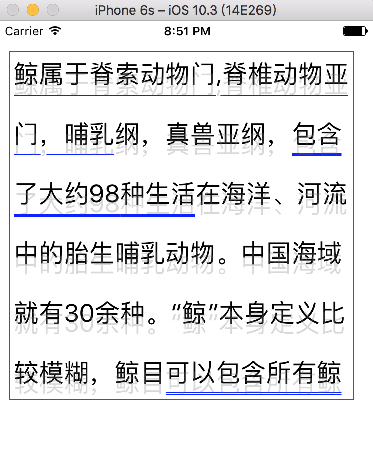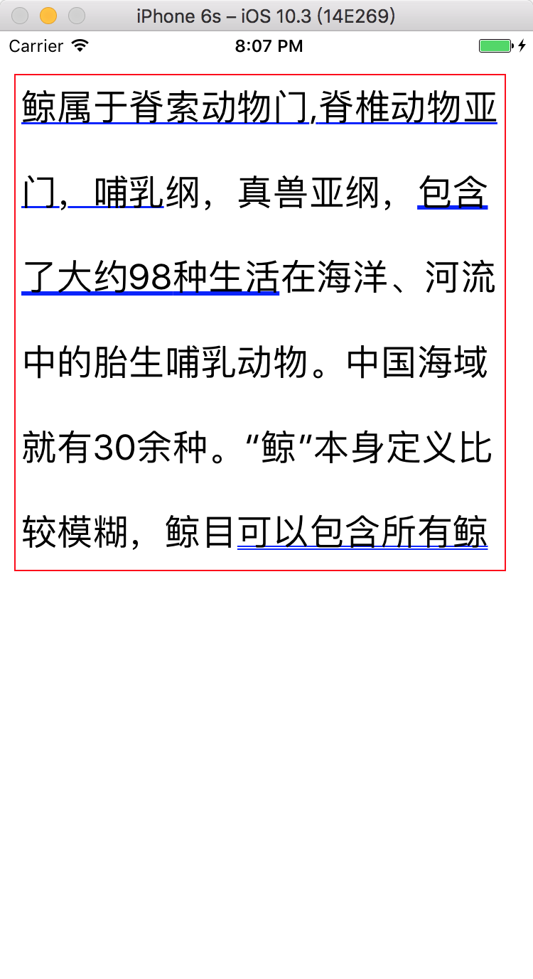 NSString *contentStr = @"鲸属于脊索动物门,脊椎动物亚门,哺乳纲,真兽亚纲,包含了大约98种生活在海洋、河流中的胎生哺乳动物。中国海域就有30余种。“鲸”本身定义比较模糊,鲸目可以包含所有鲸类,还有特定科的鲸类。";