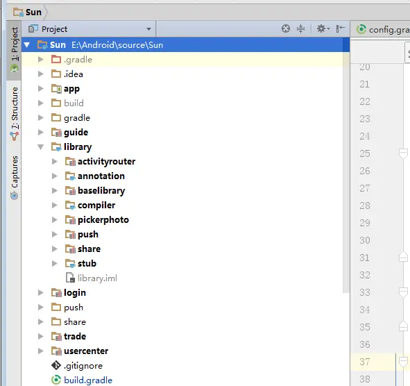 当前我们已有的Module如下:app,login, usercenter,guide,trade,baselibrary和PhotoPicker,根据他们的命名,我们知道app,login, usercenter,guide和trade是业务模块,而baselibrary和PhotoPicker是基础模块,当然基础模块我们还会继续增加,比如推送,客服等。所以如果把基础模块放在和业务模块同目录下,难免会笔记混乱,故我们把基础模块做了归类,都放在library目录下。我们讲一下如何移动Module。