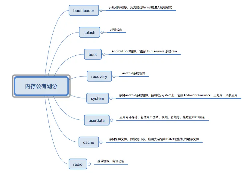设备的内存是根据逻辑储存单元来划分的,通过boot加载脚本来指定划分层级。根据不同厂商,机型,划分的层级会各有差异,但某些特定层级是大家公有的。