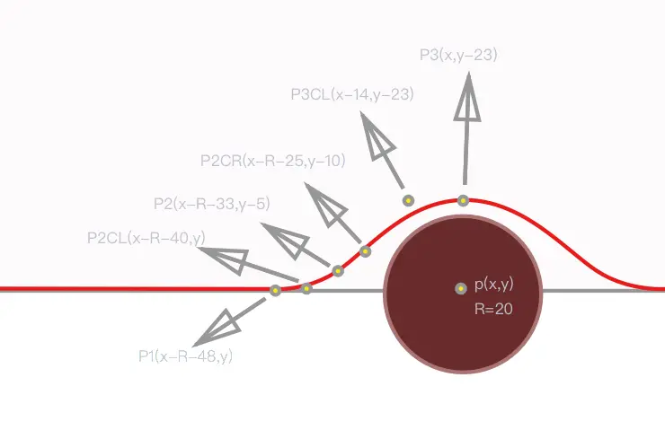 指示器里面的这个圆槽是折腾了一段时间才出来的。主要考虑到适配的问题,想想还是用比例来做的,通过Sketch临摹出曲线,然后把贝塞尔曲线的几个控制点挑出来,通过比例来做适配。图示如下,只点出来了左半边的几个点,右半边的同理。
