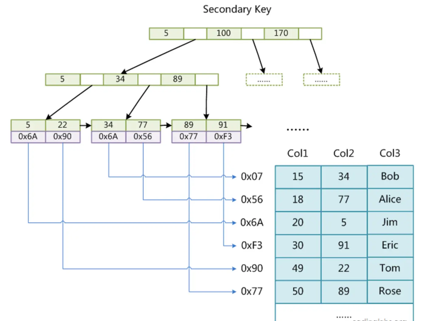图1展示了一种可能的索引方式。左边是数据表,一共有两列七条记录,最左边的是数据记录的物理地址(注意逻辑上相邻的记录在磁盘上也并不是一定物理相邻的)。为了加快Col2的查找,可以维护一个右边所示的二叉查找树,每个节点分别包含索引键值和一个指向对应数据记录物理地址的指针,这样就可以运用二叉查找在O(log2n)的复杂度内获取到相应数据。