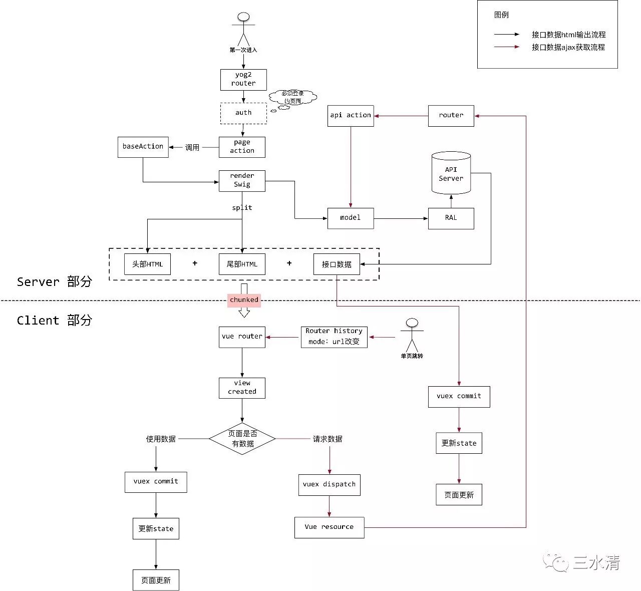 「非首次跳转」:这是一个单页应用的流程,用户点击链接,实际走的是vue的router,然后出发vue页面渲染,URL是通过history pushState mode更改实际URL,这时候如果强刷或者复制url在浏览器打开,又走「首次后端渲染」