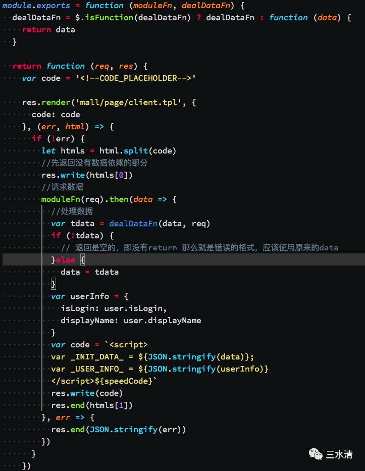 render部分,针对页面第一次请求需要将页面数据放在HTML片段中chunk输出,而不是通过ajax请求(为什么不用vue ssr,可以看下历史公众号文章《Vue SSR 从入门到Case Study》,之后单页内跳转是ajax请求)。详细代码如下: