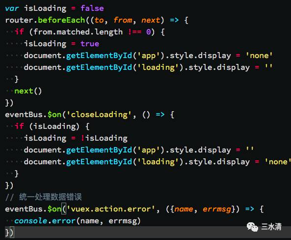 beforeEach的钩子内实现,loading的事件在vuex的action获取数据成功之后发送错误的触发有vuex 的 action / mutation 来发送事件