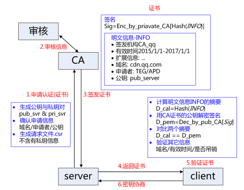 客户端读取证书中的相关的明文信息,采用相同的散列函数计算得到信息摘要,然后,利用对应CA的公钥解密签名数据,对比证书的信息摘要,如果一致,则可以确认证书的合法性,即公钥合法;