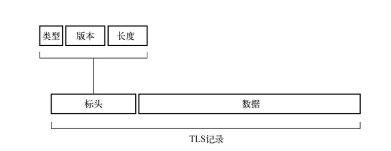 宏观上,TLS以记录协议(record protocol)实现。记录协议负责在传输连接上交换所有的底层消息,并可以配置加密。每一条TLS记录以一个短标头起始。标头包含记录内容的类型(或子协议)、协议版本和长度。消息数据紧跟在标头之后,如下图所示: