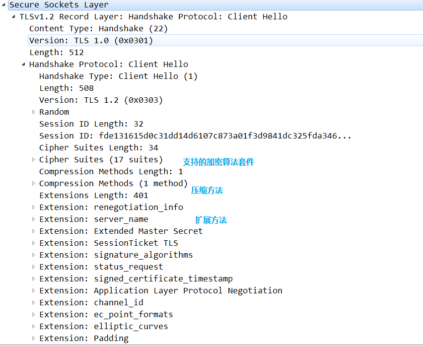 在握手流程中,ClientHello是第一条消息。这条消息将客户端的功能和首选项传送给服务器。包含客户端支持的SSL的指定版本、加密组件(Cipher Suite)列表(所使用的加密算法及密钥长度等)。
