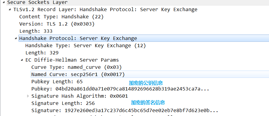ServerKeyExchange消息的目的是携带密钥交换的额外数据。消息内容对于不同的协商算法套件都会存在差异。在某些场景中,服务器不需要发送任何内容,在这些场景中就不需要发送ServerKeyExchange消息。