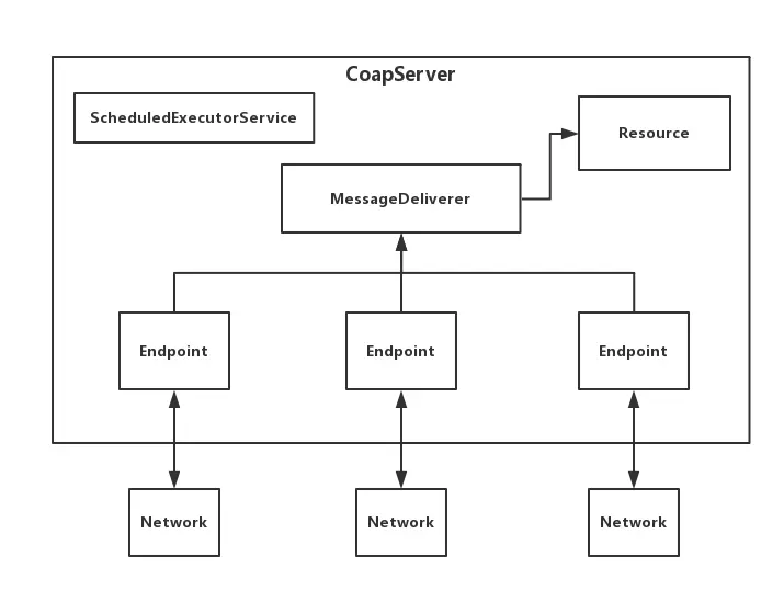 如上图,消息会从Network模块传输给对应的Endpoint节点,所有的Endpoint节点都会将消息推给MessageDeliverer,MessageDeliverer根据消息的内容传输给指定的Resource,Resource再对消息内容进行处理。