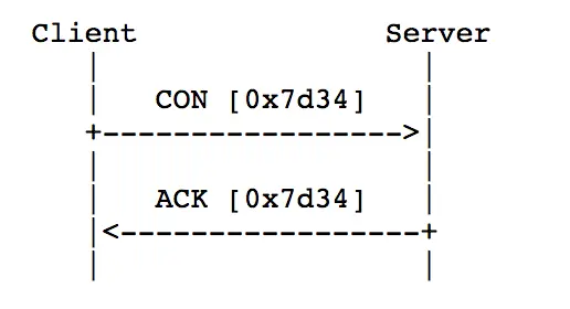 如上图,客户端通过发起一个CON报文(Message ID = 0x7d34),服务端在收到CON报文之后,需要回复一个ACK报文(Message ID = 0x7d34)。通过Message ID将CON报文和ACK报文对应起来。