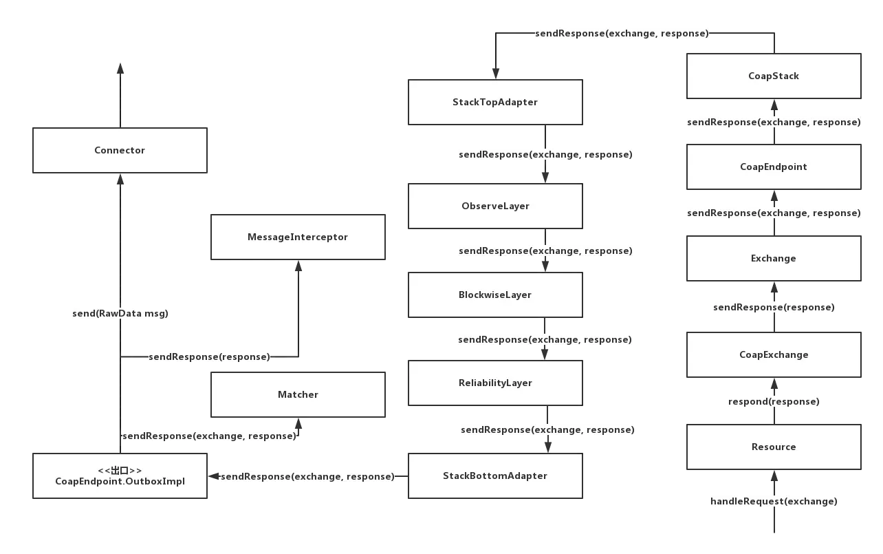 请求入口是CoapEndpoint.InboxImpl,而响应出口是CoapEndpint.OutboxImpl,简单明了。最后,让我们看看OutboxImpl.sendResponse(Exchange exchange, Response response)吧: