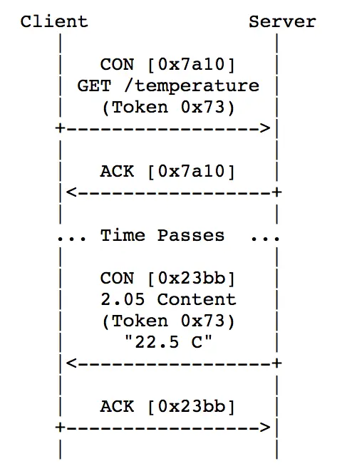 如上图,客户端发起了一个CON报文(Message ID = 0xbc90, Code = 0.01 GET, Options = {"Uri-Path":"/temperature"}, Token = 0x71),服务端在收到查询温度的请求之后,回复ACK报文(Message ID = 0xbc90, Code = 2.05 Content, Payload = "22.5 C", Token = 0x71)。也就是说服务端可以在ACK报文中,就将客户端查询温度的结果一起返回。