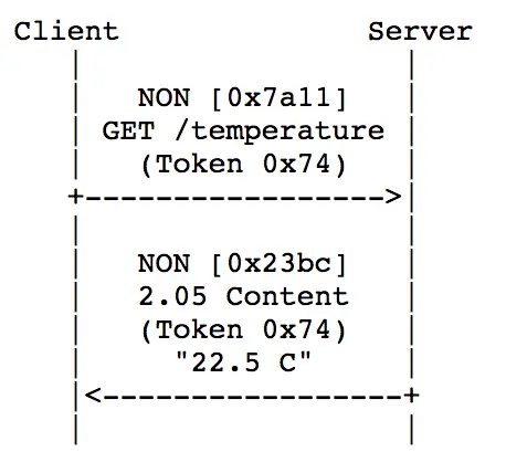 如上图,客户端发起了一个NON报文(Message ID = 0x7a11, Code = 0.01 GET, Options = {"Uri-Path":"/temperature"}, Token = 0x74),服务端在收到查询温度的请求之后,回复NON报文(Message ID = 0x23bc, Code = 2.05 Content, Payload = "22.5 C", Token = 0x74)。