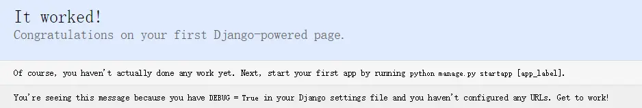 在浏览器输入 http://127.0.0.1:8000/ ,看到如下的页面提示信息: