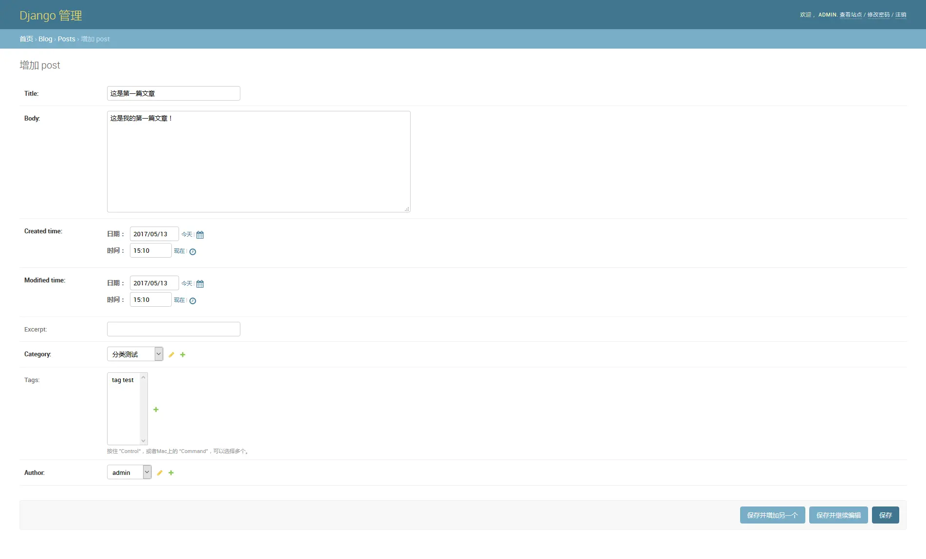 可以看到我们刚才注册的三个模型了,点击 Posts 后面的增加按钮,将进入添加 Post 的页面,也就是新增博客文章。然后在相关的地方输入一些测试用的内容,增加完后点击保存,这样文章就添加完毕了,你也可以多添加几篇看看效果。注意每篇文章必须有一个分类,在添加文章时你可以选择已有分类。如果数据库中还没有分类,在选择分类时点击 Category 后面的 + 按钮新增一个分类即可。