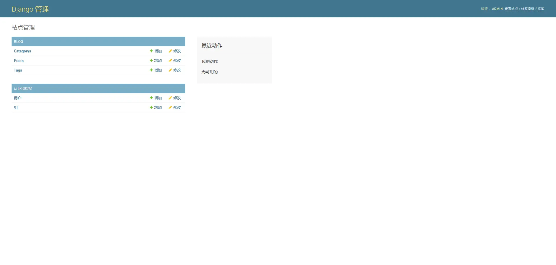 admin.site.register(Tag)由于如何定制 Admin 后台不是本教程的重点,这里只是为了简单地到达期望效果,因此不再对上述代码做过多解释。