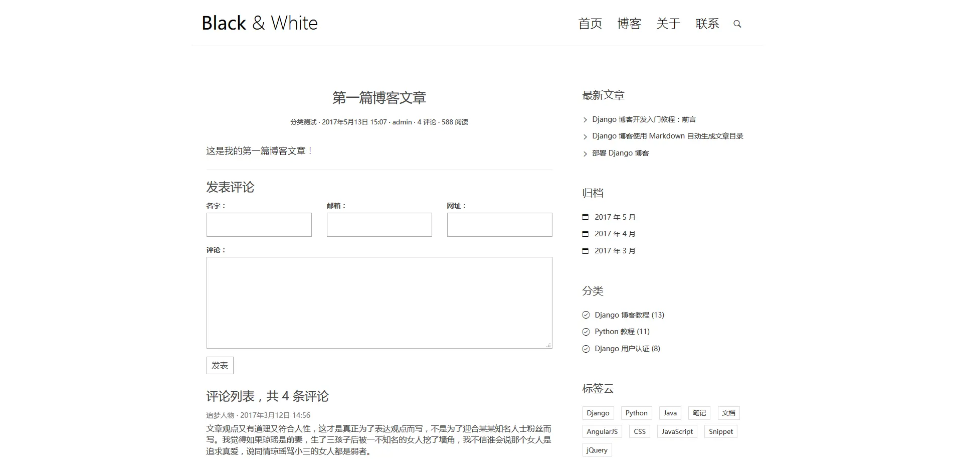 detail 页面处理起来就简单了,同样继承 base.html ,在 {% block main %}{% endblock main %} 里填充 detail.html 页面应该显示的内容,以及在 {% block toc %}{% endblock toc %} 中填写 base.html 中没有的目录部分的内容。不过目前的目录只是占位数据,我们在以后会实现如何从文章中自动摘取目录。